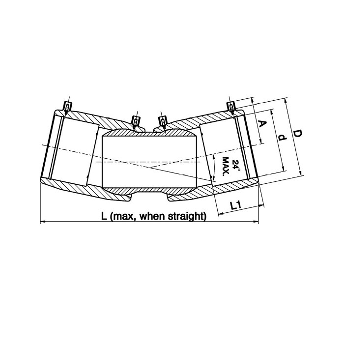 Justerbar vinkel i dimension 160mm, dubbelsidig konstruktion med maximal vinkel upp till 24°. Rördelen är klassad för PN16 och utrustad med stift 4,0, typ 9475, vilket ger en säker och stabil installation.
