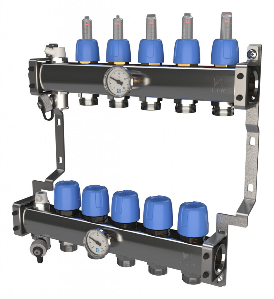 Den övre fördelarstammen märkt FLOW (tillopp) är försedd med flödesindikatorer graderade från 0,5–5l/min samt injusteringsventiler för injustering av respektive kretsflöde. Flödesindikatorerna är tillverkade av temperatur- och slagtålig plast. Plasten är resistent mot frostskyddsmedel såsom glykol samt etanol med upp till 50% resp. 30% inblandning.