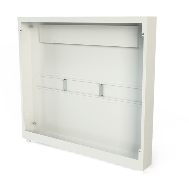 Baksidan av skåpet är försett med fyra stycken förmonterade M8 muttrar som kan användas för infästning mot LK Skåpsstativ då man önskar montera skåpet innan en betongplatta gjuts. Skåpets gavlar är försedda med knockouthål för ev. sidoanslutning av tillopp och returledning. Ovansidan av skåpet har knockouthål för ev. stamdragning genom skåpet samt knockouthål för ev. kabelgenomförningar till rumsreglering.